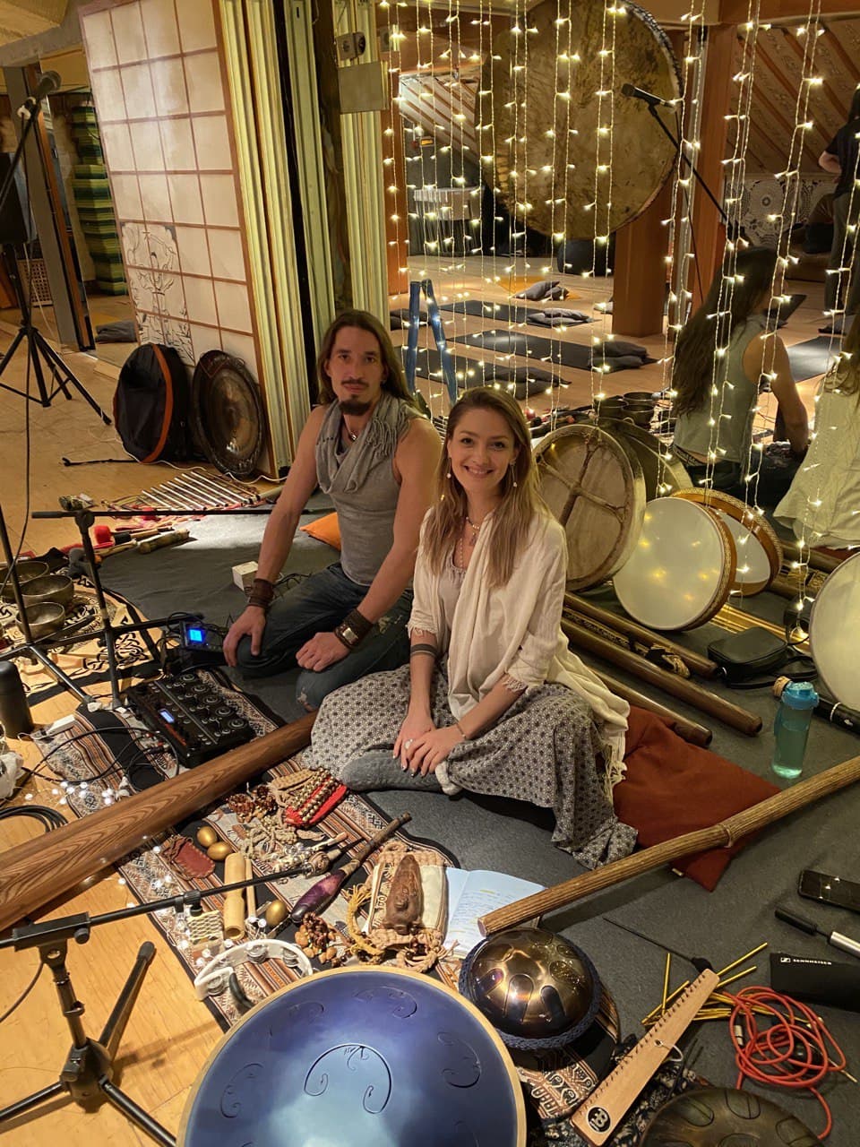 Инструментальный набор - Диджериду, Ханг драм, гонги, поющие чаши, язычковый барабан ("глюкофон"), бубен, караталы, коши, гунгру и разные другие источники звука - всё для максимальной глубины и разнообразности процесса!